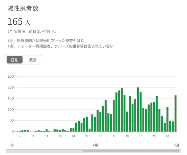 明らかに奇妙なのは、日毎の感染者の数が、 3月28日頃に180人ほどのピークを 迎え、それから急速に減少して 4月12日には10人以下となっていることです。