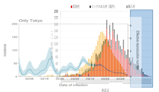 東京都においては、感染者数が増加しはじめた 3 月 14 日における実効再 生産数は2.6(95%信頼区間:2.2、3.2)であった。3 月 25 日の東京都知事に よる外出自粛の呼びかけの前後から、新規感染者数の増加が次第に鈍化し、 その後、新規感染者数は減少傾向に転じた。この結果、4 月 1 日時点での 直近 7 日間における東京都の倍加時間は 2.3 日(95%信頼区間:1.8,3.8)で あったが、5 月 1 日時点での直近7 日間の倍加時間は 3.8 日(95%信頼区 間:2.6, 6.7)となった。また、4 月 10 日の実効再生産数は 0.5 (95%信頼 区間:0.4, 0.7)に低下し、1 を下回った。4 月 10 日時点のみならず、引 き続き、実効再生産数の水準がこのまま維持されるかを注視していく必要 がある。ここで、まず注意するべきことは、図の説明に