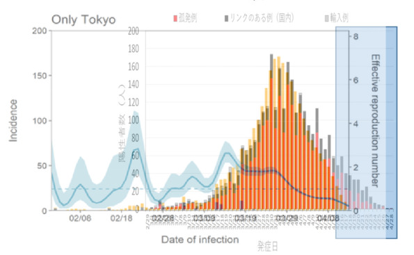 一つの可能性は、本来は、最新のデータまでの陽性確定者データを使って、20 日前の4月12日までの感染者数を推定しないといけないのですが、間違えて どこか以降の陽性確定者数をゼロにしてしまったのではないか、というもので す。そんな馬鹿なことをしているはずはないと思いたいのですが、、、