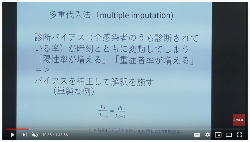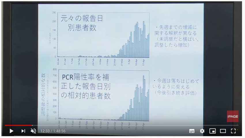 もうひとつの大きな問題は、実際の陽性確定者数が感染者の全てである、ない しは少なくともその割合は一定であると仮定しているようにみえることです。 これは西浦氏が4月24日におこなった説明会 「診断バイアスを補正しないといけない」と明言していることと矛盾するものです。