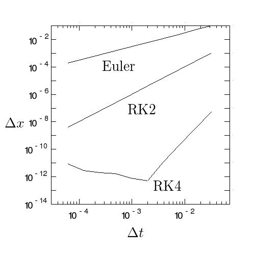 Figure 6: オイラー法及び2次、4次のルンゲクッタの、時間刻みと精度の関係。