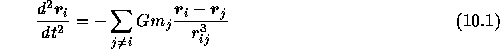 解くべき常微分方程式系は式10.1で与えられるので、初期条件を作 ればあとは各粒子の位置からそれぞれへの重力を計算するサブルーチンを書き、 それを適当な数値計算ライブラリに渡して数値積分すればそれでおしまいと行 けば話は簡単だが、それでは今日わざわざこの講義をする必要はない。そうう まく行かないのには2つの理由がある。