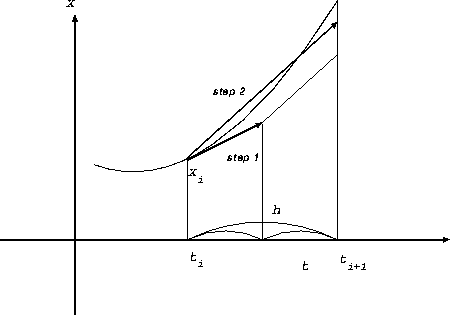 法と同様に接線を引く。が、これを次の時刻まで延ばすのではなく、ステップ