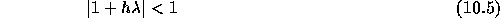 一変数(実固有値)の場合には、安定であるのはが開区間 にある場合である。複素数の固有値のときは、複素平面上で考えると、が中心 、半径 1 の円の 内部で安定ということになる。なお、上のような、元の方程式に安定解がある 時に数値解がそこにいくという性質を、特に「絶対安定性」ということがあり、 の複素平面上で絶対安定である領域のことを絶対安定領域という。