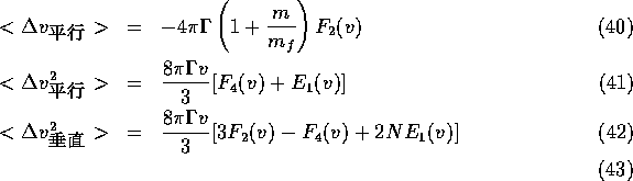 さて、次に、2次の項を見てみる。速度に平行な成分も垂直な成分も、 vが 大きい極限では0にいく。特に、 垂直な成分はv に反比例する。これに対し、 速度が0の極限では、どちらも一定値に収束する。これはテスト粒子が停止 している極限でも、回りの粒子によって揺さぶられるということを表している わけである。