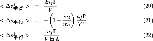で与えられる。ここで、この曲がる角度は相対軌道のものであって、テスト粒 子の軌道のものではないということに注意する必要がある。いきなり回りが動 いていてしかもテスト粒子が質量をもつというのは面倒になるので、とりあえ ずテスト粒子は質量を持つが、回りは止まっている場合を考える。この時、一 回の散乱での速度変化は以下の式に従う。