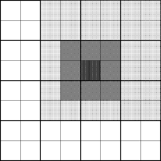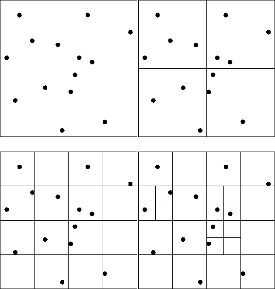 図で説明しよう。3次元の図は書きにくいし見る方も見にくいであろうから、2 次元で書くことにする(図10)。まず、平面内の適当な領域に粒子が分布して いるとしよう。粒子が有限個なので、そのすべてを含む正方形を考えることが 出来る。すべて含んでいればよいので、別に最小である必要はないが、普通は そこそこ小さくとる。これを、まず4つの小正方形(セル)にわける。で、その それぞれをさらに4つにわけるというのを再帰的に繰り返していく。