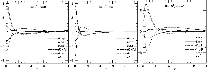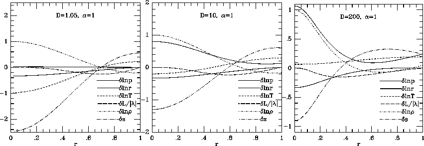 さて、少し中心密度を上げると、摂動に対する圧力の応答が変わって、中心で 圧力が上がるようになる。これは、熱を奪われることに応答して縮むと、重力 も強くなるので、つじつまをあわせるにはもうすこし縮んで圧力を上げる必要 が起きるからである。このために、温度の応答は与えたエントロピーからはず れてくる。もっとどんどん温度をさげて、Dを大きくすると、ついには、熱 を奪ったにもかかわらず、温度が中心でも上昇するようになる。