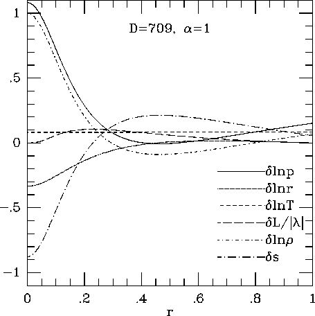 ここでチャンドラセカール大先生による linear series analysis を適用する なら、この D=709 から先は熱力学的に不安定ということになる。しかし、こ れでは不安定といってもどんなものかというのは良くわからない。不安定モー ドがどんなものかというのを初めて具体的に示したのは、Hachisu & Sugimoto [HS78]である。といっても、実は彼らが調べたのは自己重力多体 系ではなく流体の場合である。というのは、流体だと上に述べたように局所熱 平衡で議論して良くなって、熱力学的な量を使って安定性を議論することが容 易になるからである。