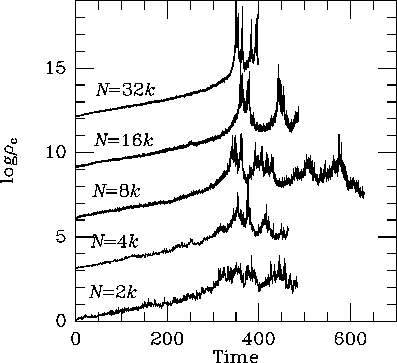 実は、このあたりの進化、すなわち重力熱力学的不安定や自己相似解について は、ガス近似、フォッカー・プランク近似を使って分布関数の進化を数値計算 する方法、N体計算の間の一致は素晴らしくよい。これが何故かというのは 本当にわかってるのかといわれると困るようなものだが。