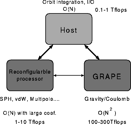 まず、重力・クーロン相互作用に専用化した、ピーク性能100 テラフロップス程度の専用プロセッサを開発するとともに、粒子系に専用化し たアーキテクチャを持つが相互作用を計算するパイプラインを再構成可能論理 (FPGA、Field Programmable Gate Array)で実現した多用途粒子系プロセッ サを開発する。このプロセッサの性能は、応用にもよるがテラフロップス程度 となろう(図1)。さらに、これらと汎用の並列計算 機を組み合わせたヘテロジニアス・マルチコンピュータを実現し、天体シミュ レーション、分子動力学計算、粒子的アプローチでの流体計算などに応用する。