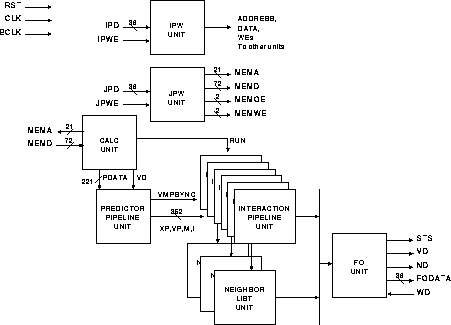 G6 チップの構成を図4に示す。従来の GRAPE チップと比べたこのチップの大 きな特色は、多数(6本)のパイプラインを集積したことと、メモリインター フェース、ホストインターフェースを含むほとんどすべての制御回路を内蔵し たことである。すなわち、1チップにメモリをつけ、簡単な I/O チャネルの先 に直接接続することで実際に動作するシステムが完成する。また、入力と出力 が分離されていることも特色であり、このために入出力の並行動作が可能にな り、高い通信スループットが実現できる。メモリには重 力を及ぼす粒子のデータ(位置、質量等)が格納され、各パイプラインの書き 込みレジスタには重力を受ける側の粒子データが格納される。計算中はメモリ からシーケンシャルに粒子データが読み出され、レジスタ内粒子との相互作用 が順番に計算され、求まった重力がアキュムレータにしまわれる。