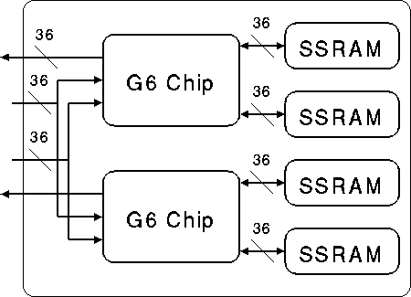 物理的には、G6PB の外部インターフェースはG6チップのものとは 大きくちがい、 LVDS をを使ったセミシリアル転送になっている。これに対し、 G6チップのインターフェースは単に 36ビット (32ビット +バイトパリティ) の同期転送であるに過ぎない。