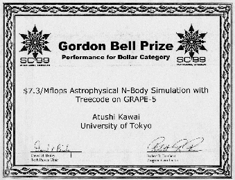 GRAPE-5 は、この GRAPE-5 チップ 8 個を 1 ボードに搭載して 40 Gflops の速度を出すものである。この GRAPE-5 を2台並列に動作させ、その 上で Barnes-Hut ツリーアルゴリズムを使った宇宙論的 N体計算で 1999年 のゴードン・ベル賞を受賞した(図6) 。今回の受賞はコスト・パフォーマンス部門で あり、実効性能において $7/Mflops という値を出したことが評価されたもの である。実効性能は2台並列のシステムで 6 Gflops であった。