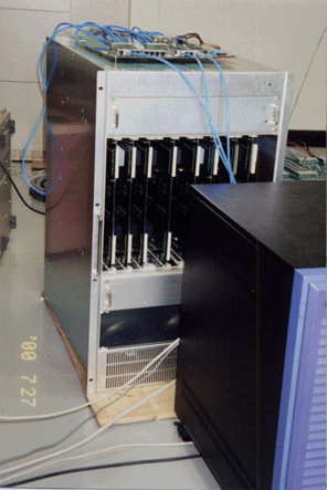 The most important achievement of this year is that we have completed the design and the testing of the prototype system consisting of multiple processor boards and network boards. Figure 5 is the prototype system with 4 processor boards and one network board. This system uses our first prototype version of the processor board with the maximum capacity of 16 processor chips. Thus, the theoretical peak speed of this prototype processor board is about 500 Gflops, and the peak speed of the system shown in figure 5 is 2 Tflops. We have successfully the operation with up to eight boards (figure 6), for the peak speed of 4 Tflops.