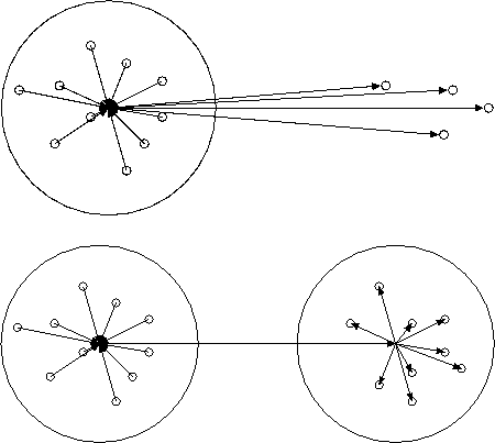 図4のように、4レベルのセルの中心での展開を合計する場合を考えてみる。ま ず、一番上のレベルのセルの中心での局所展開を、4つの子セルの中心に展開 中心をシフトしてそれぞれのレベルでの重力場の局所展開と足し合わせる。さ らに、それぞれの子セルで、合計した局所展開をまたそれらの4つの子セルの 中心にシフトし、またそこでの局所展開と足し合わせる。これを最下層のセル に達するまで繰り返すと、各セルの中心での、自分と自分に隣接するセルに入っ ている粒子を除いた他のすべての粒子による力の局所展開がもとまる。粒子一 つへの力は、この最下層での局所展開を粒子の位置で評価したものと、隣接セ ルの粒子からの力の合計ということになる。