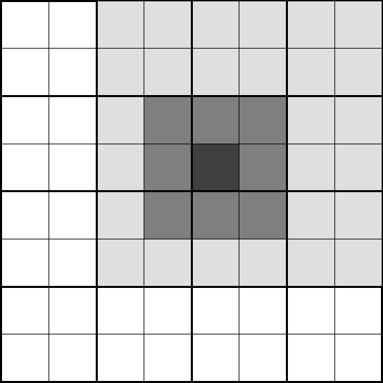 図 3: FMMの概念。もっとも濃く塗ったセルに入っている粒子への力を評価する。
