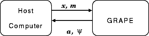 We have developed a series of special-purpose computers for N-body simulations, which we call GRAPE (GRAvity PipE). Figure 1 gives the basic idea. The host computer, which is usually a general-purpose workstation running UNIX, sends the positions and masses of particles to the GRAPE hardware. Then GRAPE hardware calculates the interaction between particles. What GRAPE hardware calculates is the right hand side of equation (1). When we use the Hermite scheme (Makino [Mak91]), the first time derivative of the force must also be calculated. Figure 2 shows the block diagram of the pipeline unit to calculate the force and its time derivative.