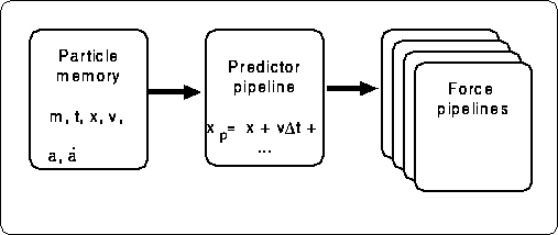 In the modified architecture shown in figure 3, the particle memory keeps all data necessary for prediction, for all particles in the system. At each timestep, the host computer sends the position and velocity of particles to be updated to GRAPE, and GRAPE calculates the forces on them and sends the results back to the host. If the number of pipelines is smaller than the number of particles in the block, this step is repeated until the forces on all particles in the block are obtained. Then the host performs the orbit integration using these calculated forces, and updates the data of the integrated particles in the particle memory of the GRAPE hardware.