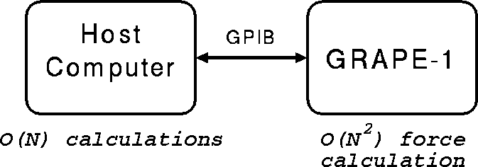 最初に作ったのは GRAPE-1 というもので、これはホスト計算機とGP-IB イン ターフェースでつながれる。ホスト計算機から粒子の位置を送ると、粒子間の 重力を計算し、合計しておくり返すわけである。この基本的な構成は現在開発 中の GRAPE-6 にいたるまで基本的には変わっていないので、ここで少し詳し く説明しておく。
