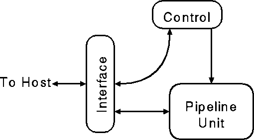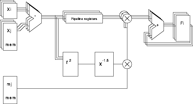 1ステップの計算は、以下のように進む。まず、ホストが粒子の 座標をメモリ(Xj mem)に送る。これらの粒子からの重力が計算される。その後、ホスト が別の座標をパイプラインの入力レジスタ(Xi)に書き込み、計算開始命令を送ると、 その座標とメモリからの座標の差を計算し、2乗して和をとり、、、といった 一連の作業をパイプラインが行ない、クロックサイクル毎に粒子1つからの重 力が計算されることになる。計算が終ると、求まった重力(Fi)をホスト計算機に送 り返す。