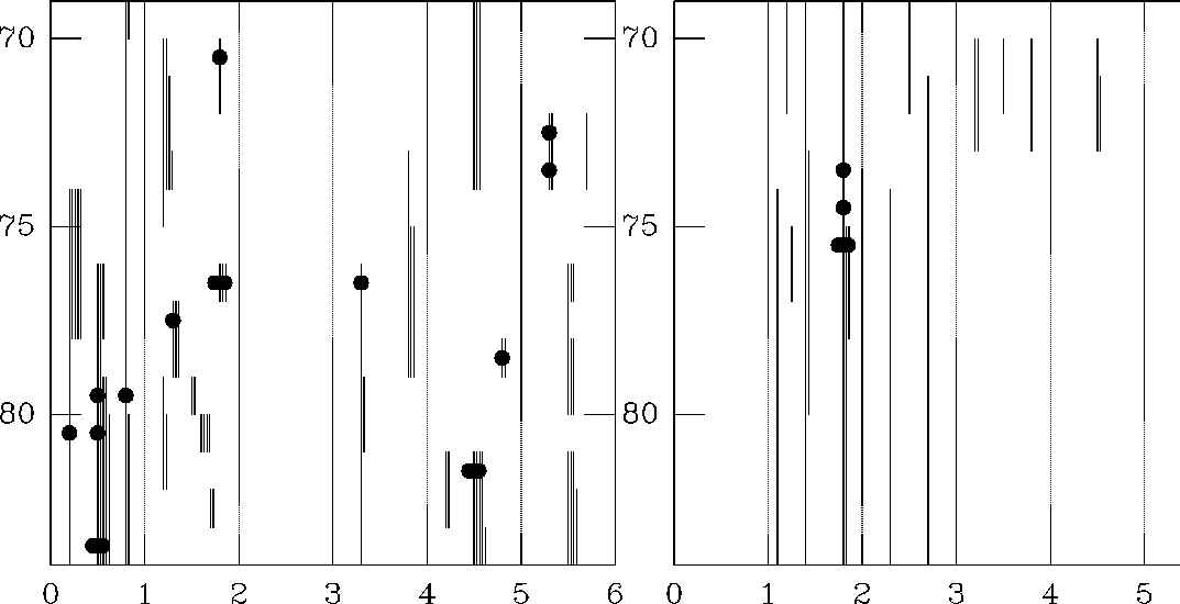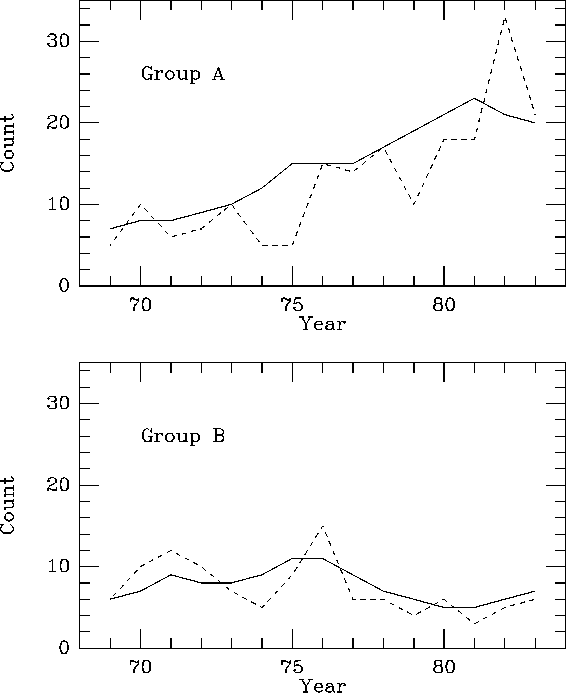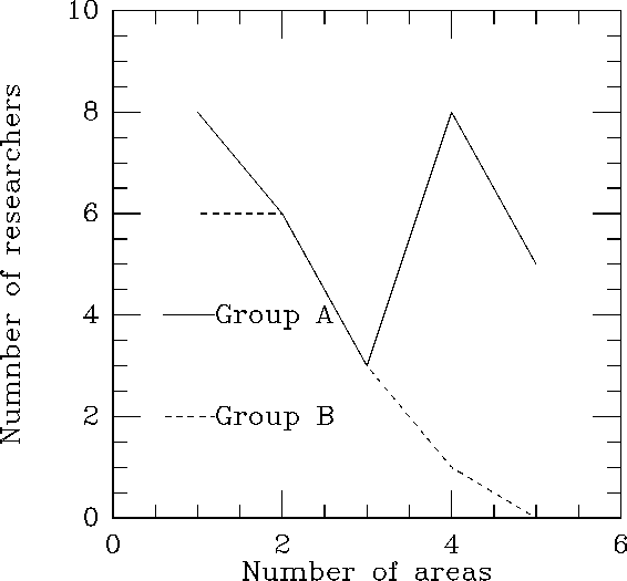 言い替えれば、グループAが研究したテーマの種類は時代を追って増え、 また研究者が短いタイムスケールで違うテーマの仕事に移っているのに 対し、グループBでは逆に次第に研究テーマを絞り、研究者のテーマが固 定する傾向があるということを意味する。これは、論文群の数だけでな く、カバーする分野の数にも表れている。すなわち、グループAでは調査 の全期間にわたり、太陽(分野番号2)を除く全分野で論文が発表されているが、グループBで は70年代前半を境にしてそれ以後は恒星・太陽(分野番号1,2)の分野に集中している。