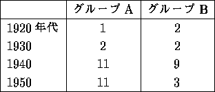 図1にそれぞれのグループの構成員数および一年ごとの発表論文数を示す。 大きな違いは、グループAの構成員数は調査期間の全体を通じてほぼ直線 的に増加しているのに対し、グループBの構成員数はほぼ一定値を保ってい ることである。この違いの原因は、単に新しく入ってくる研究者(大学 院生)の人数差による。表2に示すように、40年代生まれまでの人数はほ ぼ同じであるが、50年代生まれのメンバーの人数はグループAの11人に 対しグループBの3人と大きな差がある。