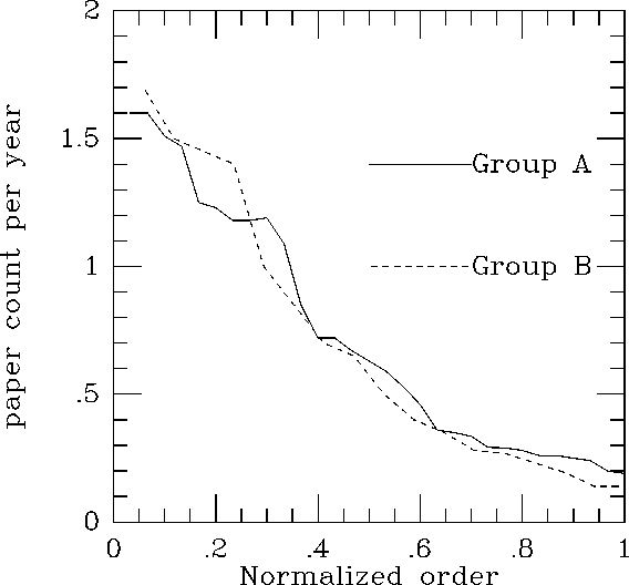 図2は両グループの研究者を1年あたりの論文生産性で並べたものである。 横軸はグループののべ構成員数にで正規化してある。こちらでは、ふた つのグループはほとんど同じふるまいをしている。すなわち、研究者間 のばらつきがグループの質に影響しているとは考えにくい。