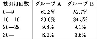 結果を表3に示す。30回以上と非常によく引用されている論文の割合は、 グループAのほうが2倍程度になっている。20以上のものでも依然として かなりの違いがある。これに対し、引用が非常に少ない論文の割合は グループAのほうが大きくなっている。すなわち、平均の引用回数ではグ ループ間に大きな違いはないが、非常によく引用された論文に関しては 有意な差が見られる。