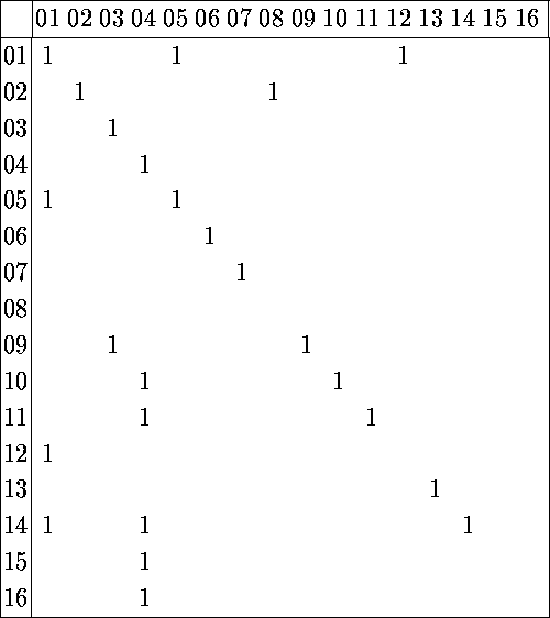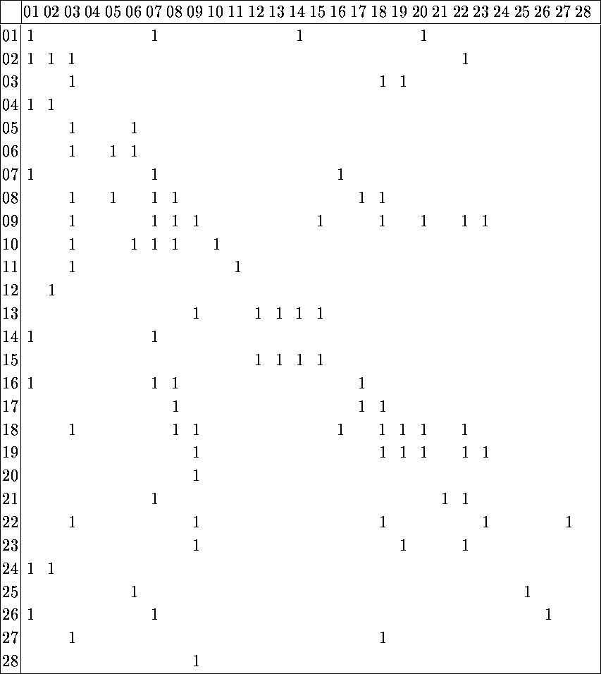 前節でみた新しく開いた研究テーマの数の違いが生まれるメカニズムを さぐるため、各グループ内での共著関係(具体的には連名で論文を書く 関係)の分析を行なった。図5及び図6に結果を示す。これは、縦軸に 論文の筆頭著者をとり、横軸に第二著者以下をとったものである。一本 でも連名の論文があればマークした。なお、研究者は年齢順に並べた。