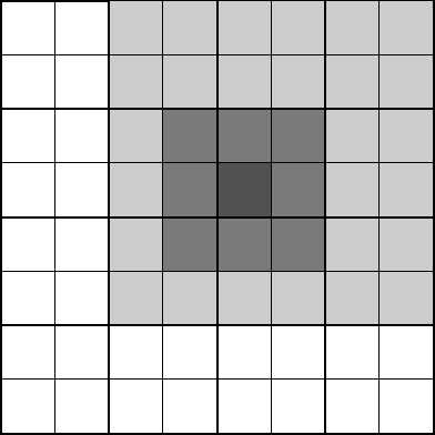 図 2: FMMの概念。もっとも濃く塗ったセルに入っている粒子への力を評価する。