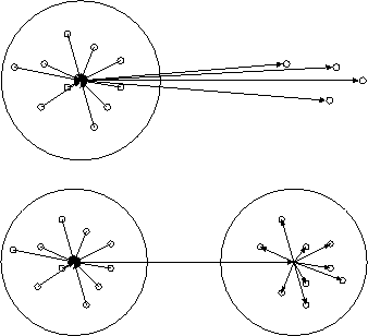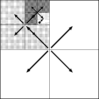 このやり方で無駄なところは、自分から見て非常に遠くにある粒子も近くにあ るものも全部同じ大きさのセルにわけていることである。計算精度のことを考 えるなら、遠くにいくほどセルが大きくなってよいし、それに対応して遠くか らの力を受けるセルのほうも大きくなるべきである。この状況を図 2に示した。正方形(3次元なら立方体)を再帰的に分割していく ことでツリー構造を作り、あるセルは、自分とは隣接していないが自分の親と は隣接しているセルからの寄与だけを計算する。図では2次元なのでそのよう なセルは27個であるが、3次元では189個になることに注意してほしい。親セル が受けている力は調和関数の展開の中心をシフトして自分の分とあわせる。こ の時、上から順番にやっていけば、それぞれのセルについて一度だけ親からの 分をシフトすればよい。親から伝わってきたものは、その上のレベルからの寄 与をすでに含んでいるからである(図 3)。なお、多重極展開の ほうは、逆に子セルの中心での展開を中心をシフトして足し合わせることで親 セルの展開を構成できる。
