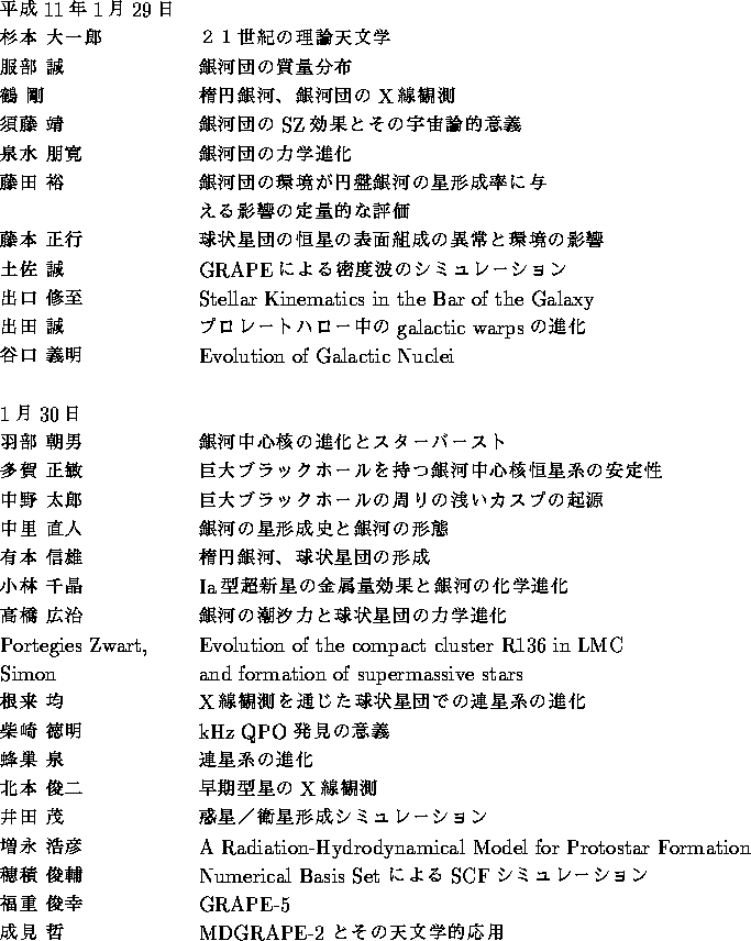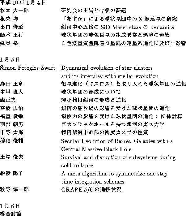 これらの研究を総合的に進めるのに、平成 9-10 年はちょうど時宜を得ていた と思われる。観測データとしては、一例をあげれば楕円銀河のなかの星のメタ リシティの詳細な観測、あるいは球状星団のメタリシティの分布の詳しい観測 が出てきて、化学進化と力学進化をカップルさせた理論計算によってそれらの 起源に迫れるようになってきた。また、HST等による高分解能の観測により、 マゼラン雲等には非常に高密度でしかも大質量星を多数持つ非常に若い星団が あることがわかってきた。これに対し、理論計算の側では例えばSPH による流 体計算と radiative cooling, 星形成、超新星によるエネルギーとメタルの供 給等の相互作用をとり入れた現実的な楕円銀河や球状星団の形成モデル、ある いは、独立時間刻みによる高精度の多体計算と恒星の進化モデルを組み合わせ た球状星団の進化モデルといったものが扱えるようになりつつあった。こうし て、既存の手法に新しい概念、手法を組合わせ、自己重力多体系自身の進化と その構成要素である恒星の進化の相互作用をはじめとする多様な問題にアプロー チするため、研究会が持たれ、研究成果をあげることができた。