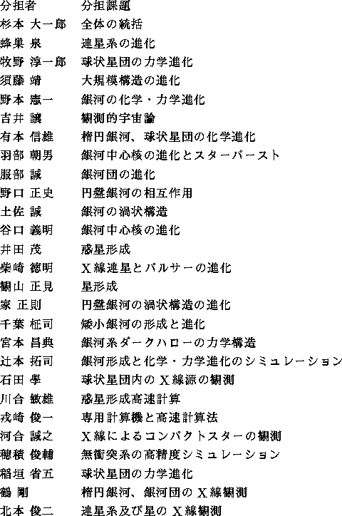 平成8年にこの研究を組織した時、わが国における恒星系等の自己重力多体系 の研究は、月、惑星の形成の研究から宇宙の大規模構造の解明まで広範囲に渡っ て行なわれており、各々の研究では高いレベルにあったといえるが、対象を異 にする研究者間の相互作用が弱かった。また、平成6年度に完成した重力多体 問題専用計算機 GRAPE-4 を使って、理想化された(星の進化や親銀河との相 互作用を考えない)球状星団の進化や、ダークマターハローや銀河中心の高密 度恒星系についての理論的な理解はかなり進んだが、そのような理論的な研究 は、最近急速に発展した多様な手法による豊富な観測と比較するには若干距離 があるものであった。この基盤研究では、GRAPE-4 に代表されるような大規模 な数値シミュレーションによって可能になってきた自己重力多体系の理解を、 どのようにして現実の観測データとの比較ができる現実的な天体の理解にまで 発展させていけばよいかを整理し、理論研究の新しい方向を探ることを目的と した。現実的な問題のなかでも、特に重要と思われる自己重力多体系自身の進化とその 構成要素である恒星の進化の間の様々な相互作用に着目した。