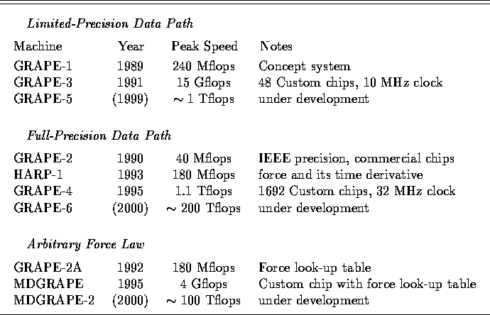 One of these projects has resulted in the GRAPE (short for GRAvity PipE) family of special-purpose hardware, designed and built by a small group of astrophysicists at the University of Tokyo [1]. Like a graphics accelerator speeding up graphics calculations on a workstation, without changing the software running on that workstation, the GRAPE acts as a Newtonian force accelerator, in the form of an attached piece of hardware. In a large-scale gravitational N-body calculation, where N is the number of particles, almost all instructions of the corresponding computer program are thus performed on a standard workstation, while only the gravitational force calculations, in innermost loop, are replaced by a function call to the special-purpose hardware.