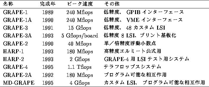 GRAPE は、これまで、さまざまな計算に使われてきた。我々のグループで行なっ たものでは、例えば惑星形成過程のシミュレーション、球状星団の進化、銀河 中心におけるブラックホール連星の形成とその進化、銀河同士の衝突、合体、 銀河団の進化、多重重力レンズによる 3K背景放射の非等方性の変化、などが あげられる。また、 GRAPE-3A はコピーをコマーシャルベースで購入すること ができるので、他のグループによって宇宙の大規模構造の形成、銀河や球状星 団の形成などのシミュレーションが行なわれている。現在ではGRAPE-3Aを導入 した研究グループは20以上になった。また、渦糸法を使った3次元流体のシミュ レーションにも使われるようになりはじめている。GRAPE-4 も、小規模なシス テムがイギリス、ドイツにあり、フランスにも導入される予定である。さらに、 分子動力学計算用に重力以外の相互作用も計算できるようにしたものが、画像 技研と富士ゼロックスの2社から販売されている。