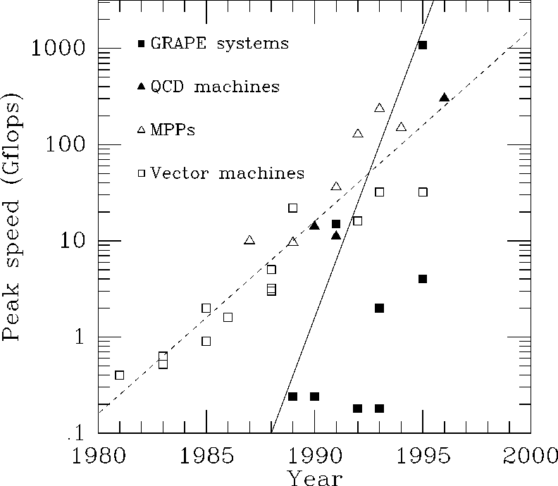 表1と図2に、我々がこれまでに開発したシステムの計算性能と計算精度などを 簡単にまとめる。GRAPE-1 と GRAPE-2 は、DMDP と同じように市販の LSI を 使っている。これらはどちらも重力計算のためのパイプライン一本だけの計算 機であり、計算速度はDMDPと大差ない。 GRAPE-1 では、演算毎に違うデータ形式を使い、配線やICの数を極力小さくす る努力をした。これに対し、GRAPE-2では市販の浮動小数点演算LSIを使った。