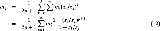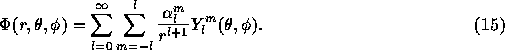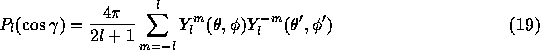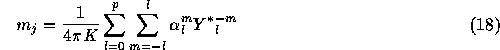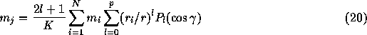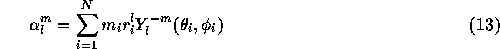 As in the case of two dimensions, we can directly translate the positions and masses of physical particles to that of pseudoparticles. The formal expression is a triple summation over i, l, and m. However, we can simplify it using the addition theorem of spherical harmonics. The addition theorem is