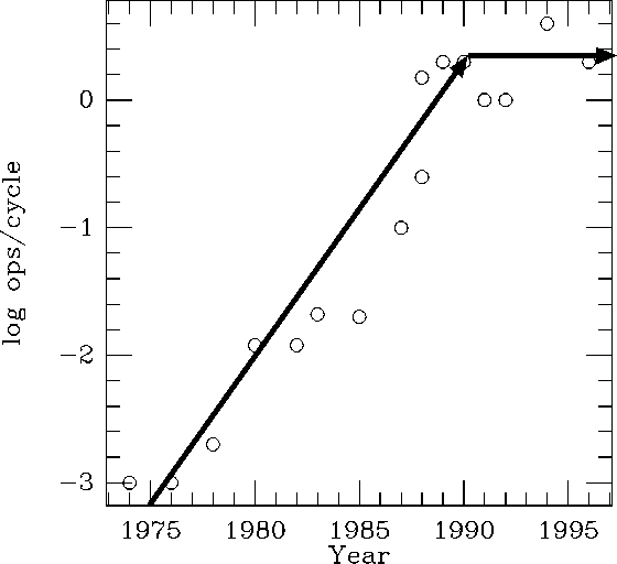 However, if we look back the evolution of the microprocessors, we can see that they are now in the same trap as vector processors were in 1980s. Figure 2 shows the maximum number of floating point operations performed per clock cycle for representative microprocessors. The increase in the operation count per cycle was very fast, until it reaches two (one addition and one multiplication ) by 1990. Then the increase stalled, and in 1990s there was essentially no increase. Even in the year 2000, there is no microprocessor which can perform more than four floating point operations per cycle.