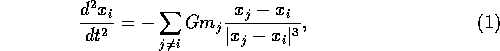 This situation, however, has changed completely, as we've seen in the previous section. To give a concrete example, let us discuss the astrophysical N-body problem and our GRAPE (GRAvity PipE) hardware specialized for that problem. The master equation for the gravitational N-body problem is given by: