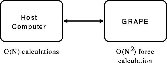 If N is larger than several tens, the calculation cost of the right hand side of equation (1) dominates the total calculation cost. If N is very large, we could use sophisticated algorithms such as the Barnes-Hut treecode[1], FMM[4], or the particle-mesh method. However, with treecode or FMM, the direct evaluation of gravitational interaction between near-neighbor particles still dominates the total cost. Even in the case of the particle mesh method, if we want high accuracy, near-neighbor interaction must be calculated directly.