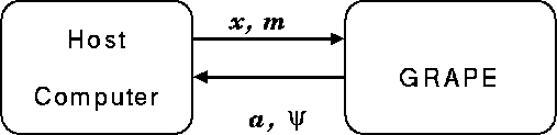 We have developed a series of special-purpose computers for N-body simulations, which we call GRAPE (GRAvity PipE). Figure 1 gives the basic idea. The host computer, which is usually a general-purpose workstation running UNIX, send the positions and masses of particles to the GRAPE hardware. Then GRAPE hardware calculates the interaction between particles. What GRAPE hardware calculates is the right hand side of equation (1). When we use the Hermite scheme (Makino [1991b]), the first time derivative of the force must also be calculated. In this case, velocities of particles are needed. Figure 2 shows the block diagram of the pipeline unit to calculate the force and its time derivative.