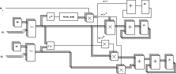 In the modified architecture shown in figure 3, the particle memory keeps all data necessary for prediction, for all particles in the system. At each blockstep, the host computer writes the position and velocity of particles to be updated, and GRAPE calculates the forces on them and sends the results back to the host. If the number of pipelines is smaller than the number of particles in the block, this step is repeated until the forces on all particles in the block are obtained. Then the host performs the orbit integration using these calculated forces, and updates the data of the integrated particles in the particle memory of the GRAPE hardware.