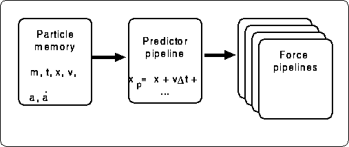 In order to combine the individual timestep scheme with GRAPE hardware, one modification of the basic architecture is necessary. Figure 3 shows the change. As described in the previous section, we have to predict the position (and velocity in the case of the Hermite scheme) of all particles to calculate the forces on the particles in the current blockstep. This prediction must also be done on the GRAPE hardware, since otherwize the amount of the calculation the host computer has to do becomes too large.