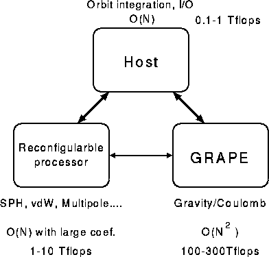 Thus, GRAPE-6 might become a heterogeneous computer with three, not two, components (figure 4). We may be able to use the reconfigurable part for various applications, such as the calculation of van der Waals force in molecular dynamics and evaluation and shifting of spherical harmonics in the fast multipole method.