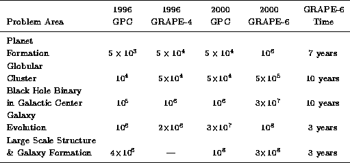 Table 2 gives a rough estimate of the maximum number of particles we will be able to use on both the general-purpose computers and GRAPE-6 at year 2000, based on the numbers at present. We here assumed that on both general-purpose computers and on GRAPE, we use most efficient algorithm. For collisional systems, we can expect very large gain, even if we take into account the difference in the algorithm used. For collisionless calculations, the gain is not very large, mainly because the size of the calculation is not limited by the calculation speed but by the amount of the memory available. For collisionless calculations, however, the calculation speed of GRAPE will be much faster.