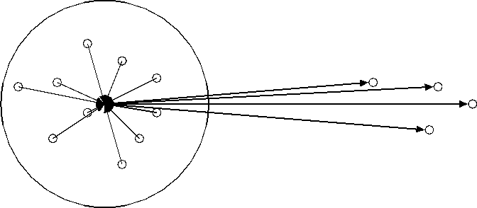 このやり方で無駄なところは、自分から見て非常に遠くにある粒子も近くにあ るものも全部同じ大きさのセルにわけていることである。計算精度のことを考 えるなら、遠くにいくほどセルが大きくなってよい。これを実現するために、 正方形(3次元なら立方体)を再帰的に分割していくことでツリー構造を作る。 ある粒子への力を計算するには、トップレベルからツリーを降りていって、大 きさに比べて十分遠い、つまり誤差が小さくなったとみなせるところで止めれ ばよい。十分遠いかどうかの判定には、通常は 見込み角と呼ばれる量