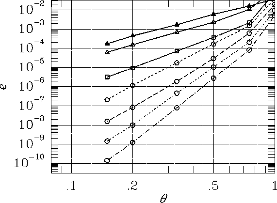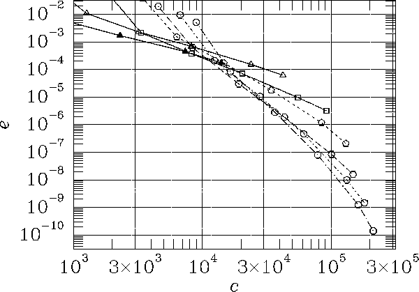 さて、先に述べたように、必要な計算精度を決めれば最適な(計算量を最小にする)次数と見込み 角の組合せが存在しているはずである。これは、計算量と計算精度の関係を見 ればわかるので、それを図にしたものが図4である。要求する計算精度を上げて いくと、最適次数は上がっていくことがわかる。逆に、見込み角はほぼ一定の ままであることに注意して欲しい。